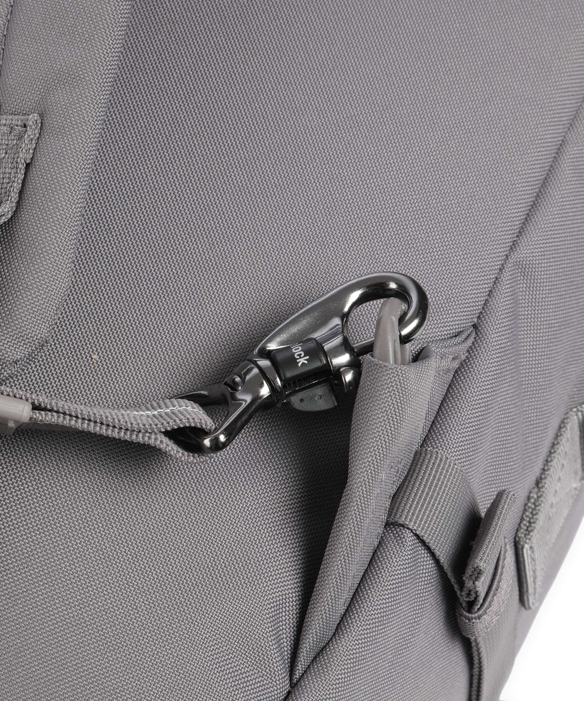 • closes with clip fastener, closes with two-way zipper (lockable, stitch-resistant zipper for better theft protection)